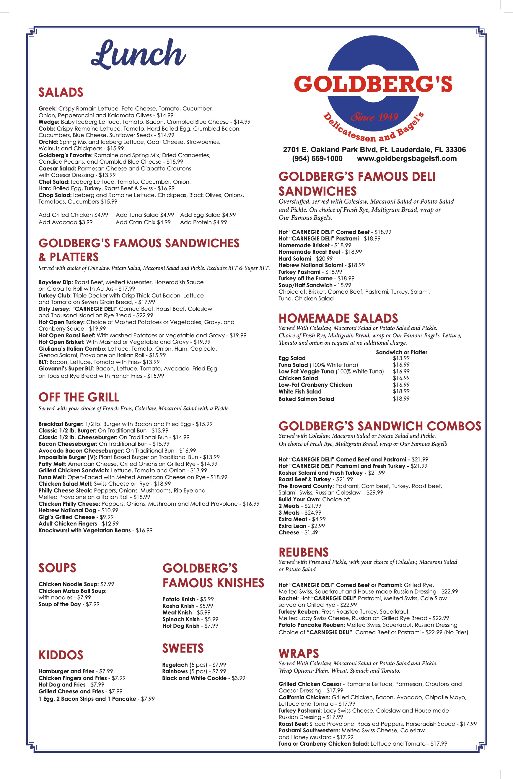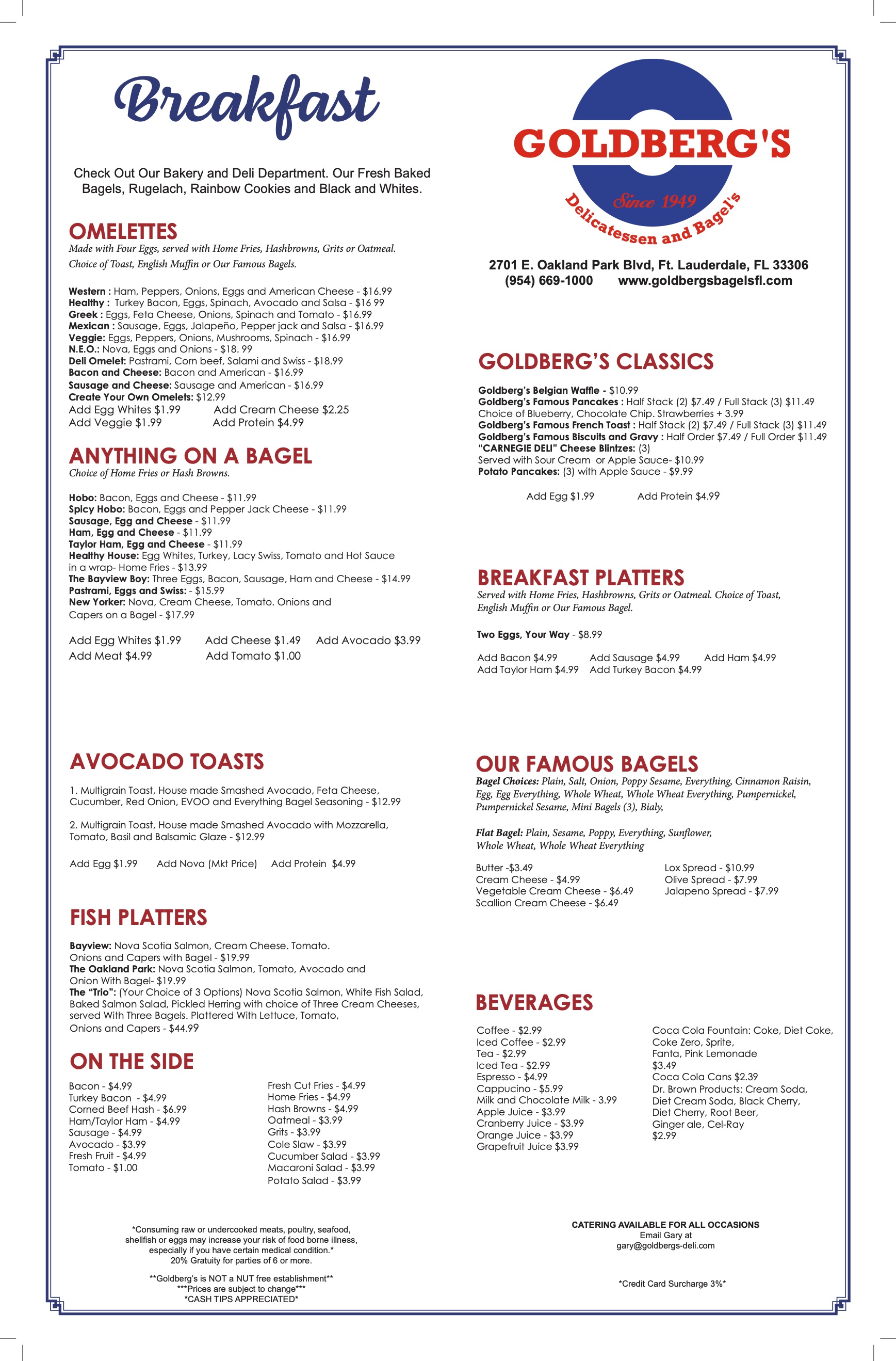 – 2701 E Oakland Park Blvd – A new place for Bagels, appetizing, deli, and more is opening its doors, at 7 AM tomorrow (Thursday, September 7). I was able to get a sneak peek of the completely renovated location and look over the menus.  Food pix to follow. Check out their website. https://www.goldbergsbagelsfl.com