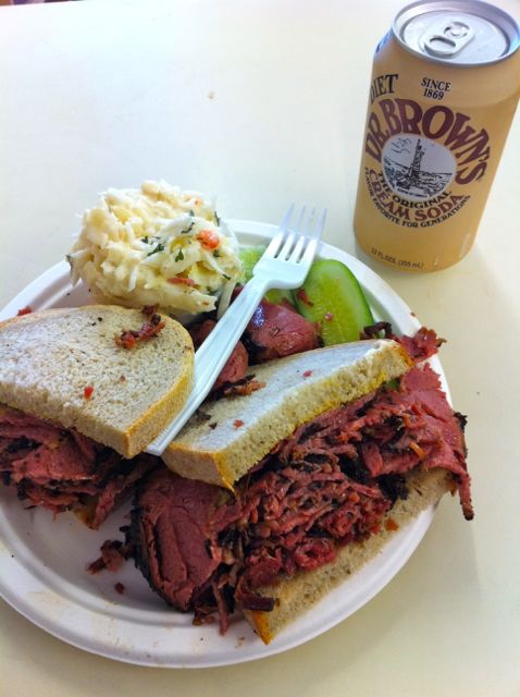 It’s understandable, then, why lots of displaced New Yorkers appear driven to find good Corned Beef or Pastrami sandwiches.  I don’t know if it’s just nostalgia or a physical need to absorb the fatty steamed meats of another time and place, but many eventually find their way to Pumperdale’s on Commercial Blvd. It’s a surprisingly friendly place with lots of customers who jam in for one of closest NY Deli experiences you’re going to find in the area. Now don’t get me wrong…it’s not NY, but for a deli-starving expat from the Big Apple, this is just fine.  It should be noted there are a few rules . Step into the restaurant and you’re on a fast-moving line, so slackers beware… know what you want a.s.a.p. cause there are other hungry people behind you. Need a beverage???…Go to the beverage cooler in the back to select one of the Dr. Brown’s flavors (they have other stuff, but does it really matter?) and find a seat.  The small tables are close together so make friends and listen for your order…then pick it up and enjoy. The folks here are friendly and if you should want to show your appreciation, put a little money in the tip-jar and the sandwich mavens behind the counter will thank you and shout-out “SUBWAY.” It’s a throwback to the old days when the tip money was used to ride home on the NY subway. After eating & schmoozing, step up to the cashier and recite what you ate as it’s rung in to the register, then pay and you’re done. On one trip I was behind a lady who couldn’t recall what she had just eaten. “Well,” she said with a quizzical look, “I’m not quite sure, but it was very good!”  And for South Florida, Pomperdale’s really is.
